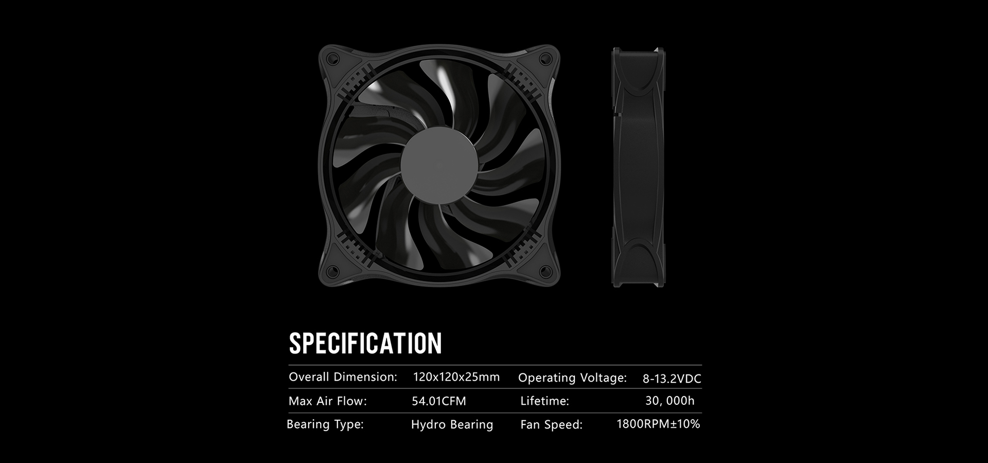 Operating Voltage:8-13.2VDC Max. Air Flow:54.01CFM